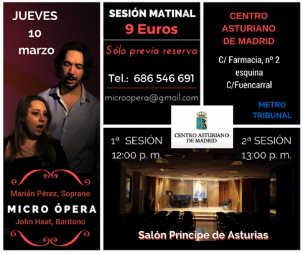 El próximo jueves 10 de marzo en el Salón Príncipe de Asturias se celebrarán dos sesiones matinales de micro ópera. La primera a las 12