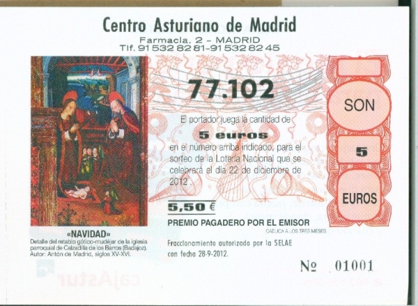 El Centro Asturiano juega este año el número 77.102, en papeletas de cinco euros. A la venta en Consejería, Secretaría y Quinta Asturias.